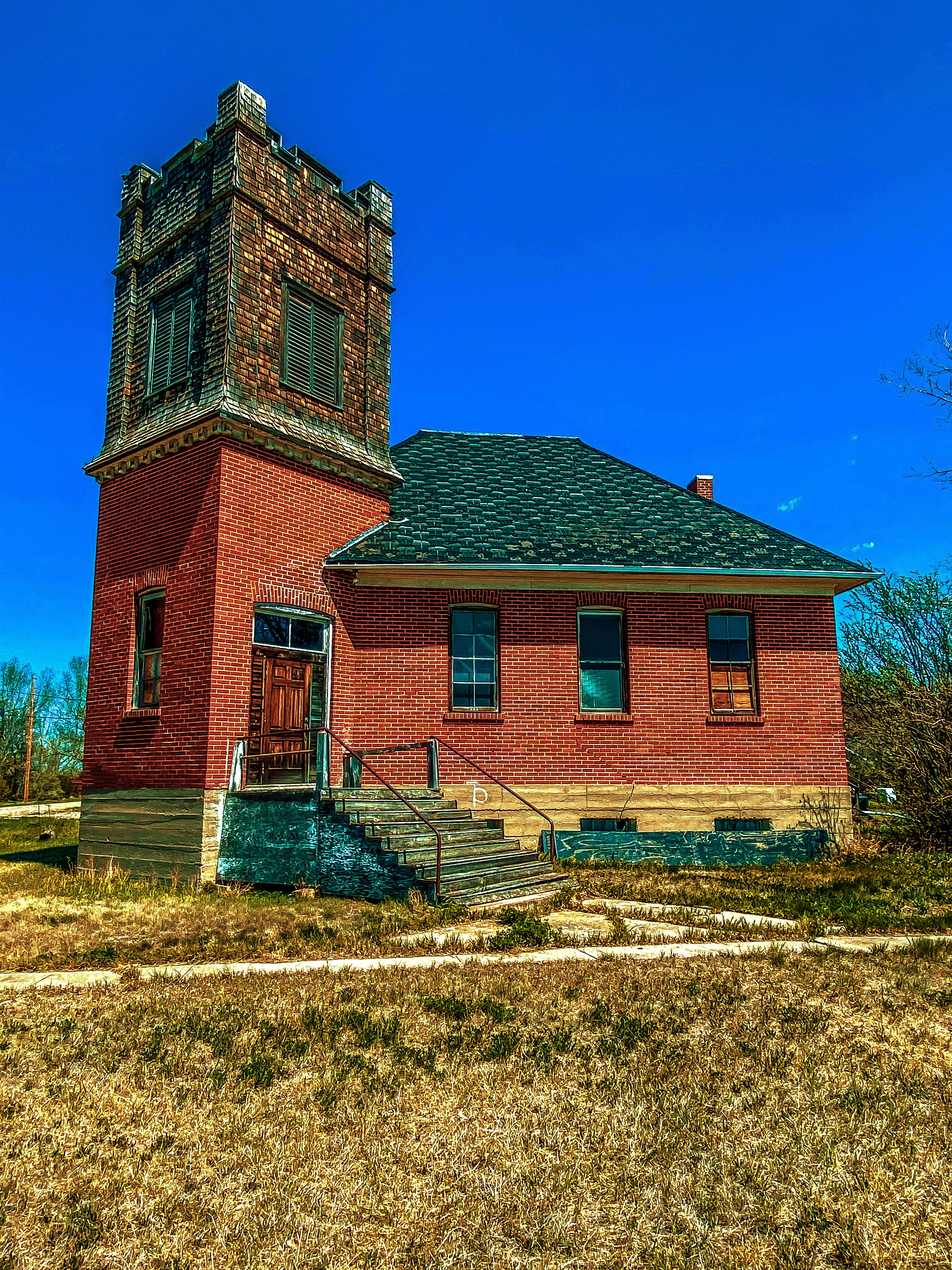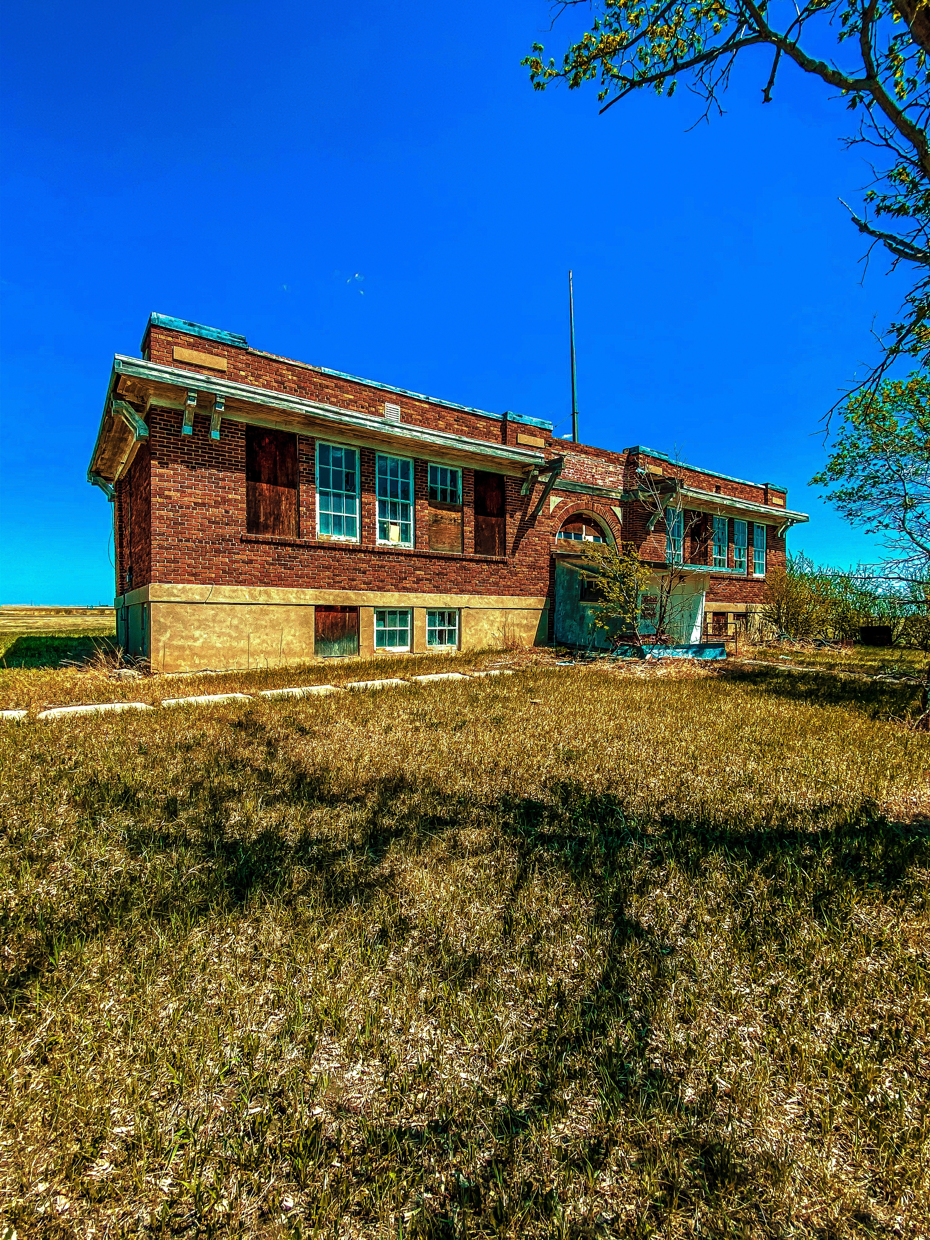 Wasn’t hard to find what we came to this town looking for in the first place. This abandoned school. Just sitting there all by itself. Riceton school closed in 1995. It’s looks like it was just locked up and left. One of the big trees near the front of the school looks like it split and a huge part of it is laying across the front sidewalk. There looks to be a older foundation next to the school. If I had guess I’d say it was from a old school. Denver school 1912-1933.